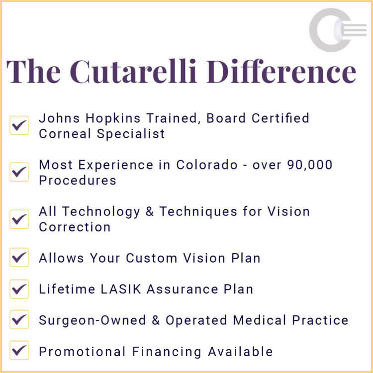 Firstly, Dr. Cutarelli, a board-certified ophthalmologist who completed his residency training at the prestigious Johns Hopkins University followed by two surgical fellowships, performs all of these procedures at Cutarelli Vision. He is also the MOST EXPERIENCED LASIK SURGEON in all of Colorado, so patients know they are getting the very best!